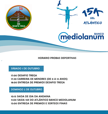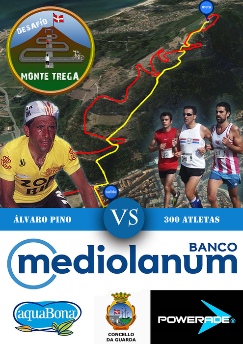 As probas deportivas 15K DO ATLÁNTICO do sábado concéntranse na Praza de Avelino Vicente e comezan ás 17.00 hora co “Desafío do Trega”. Esta nova proba deportiva  é unha competición entre os atletas que ascenderán polos sendeiros e Álvaro Pino, exciclista de Ponteareas, que participará co “maillot” amarelo e subirá o Monte Santa Trega pola estrada coa bicicleta da lle dou a súa vitoria na Volta España do 1986. O gañador será o primeira que chegue a cima do coñecido Monte Santa Trega.
