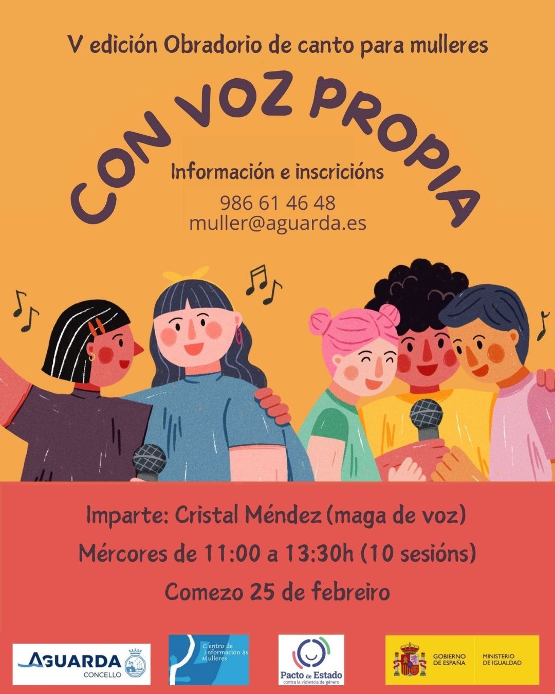 As inscricións xa están abertas a través do teléfono do Centro de Información da Muller (CIM) 986 61 46 48 e o correo electrónico muller@aguarda.es .
