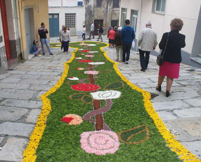 Este ano, participaron na elaboración das alfombras florais un total de 9 grupos veciñais, con cadanseu deseño nas rúas Oliva, Hernán Cortés, Malteses e Concepción Arenal, así como na zona da Ribera, a Praza do Reló e a praza José María Lomba. Ademais de flores, as creadores e creadores das alfombras florais utilizaron materiais como buxo, cortizas ou palla coas que ornamentaron as orixinais alfombras florais.