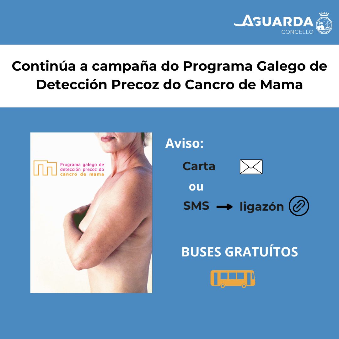 Continúa a campaña do Programa Galego de Detección Precoz do Cancro de Mama. As mulleres que reciban o SMS deberán pinchar na ligazón que aparece para ter acceso ás rutas e aos horarios de transporte gratuíto que facilita este Programa.