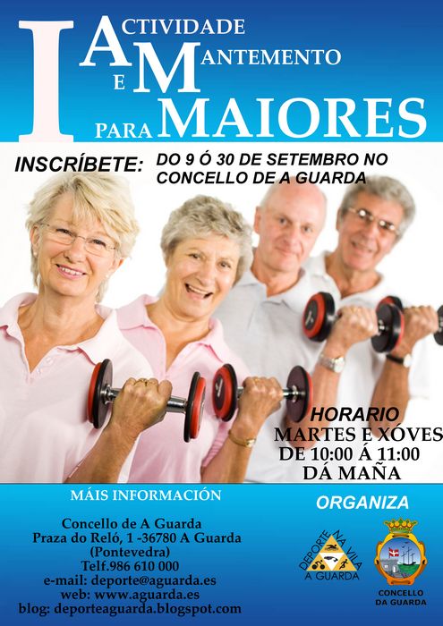 A Concellería de Deportes do Concello da Guarda organiza, para este vindeiro mes de outubro, a “I Actividade e Mantemento para Maiores”. Esta iniciativa, que será de balde, ten como principal obxectivo potenciar a actividade física como medio de mantemento da saúde e do benestar xeral do corpo.