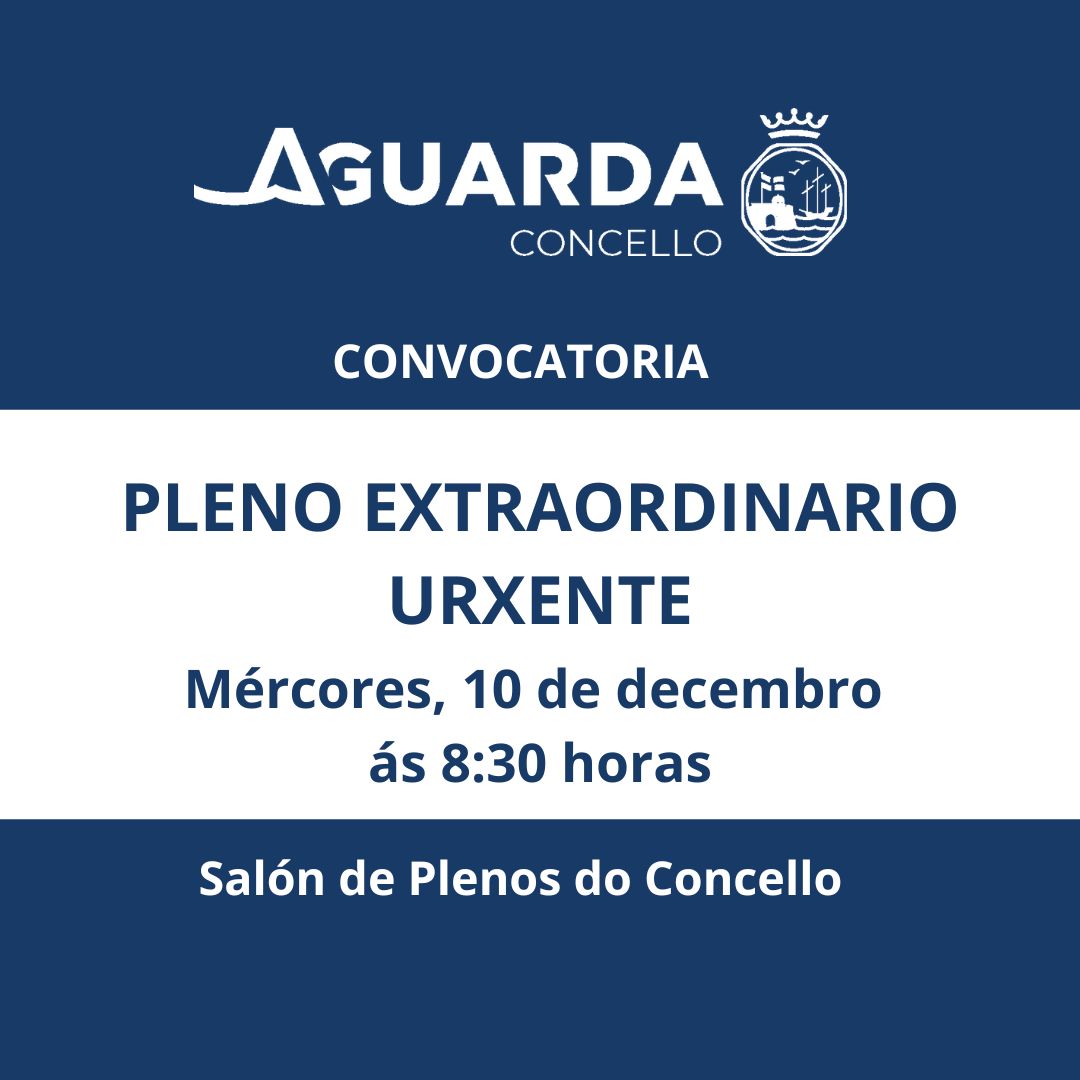 O Concello da Guarda convoca un pleno de carácter extraordinario urxente para este mércores 10 de decembro ás 8:30h no Salón de Plenos da Casa do Concello.