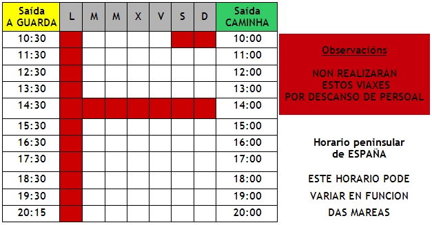 Este horario manterase ata a chegada do verán tendo en conta que se respectarán os descansos do persoal. Polo que non haberá servizo os luns, tampouco sairá ás 14.30 h e a primeira saída do sábado e domingo será ás 11.30 h.