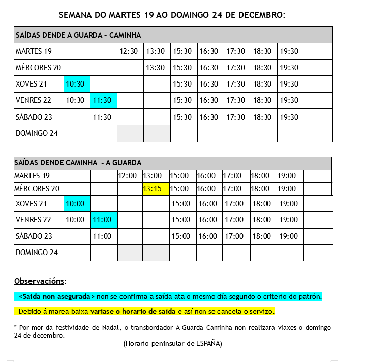Horario semanal do transbordador A Guarda – Caminha do martes 19 ao domingo 24 de decembro