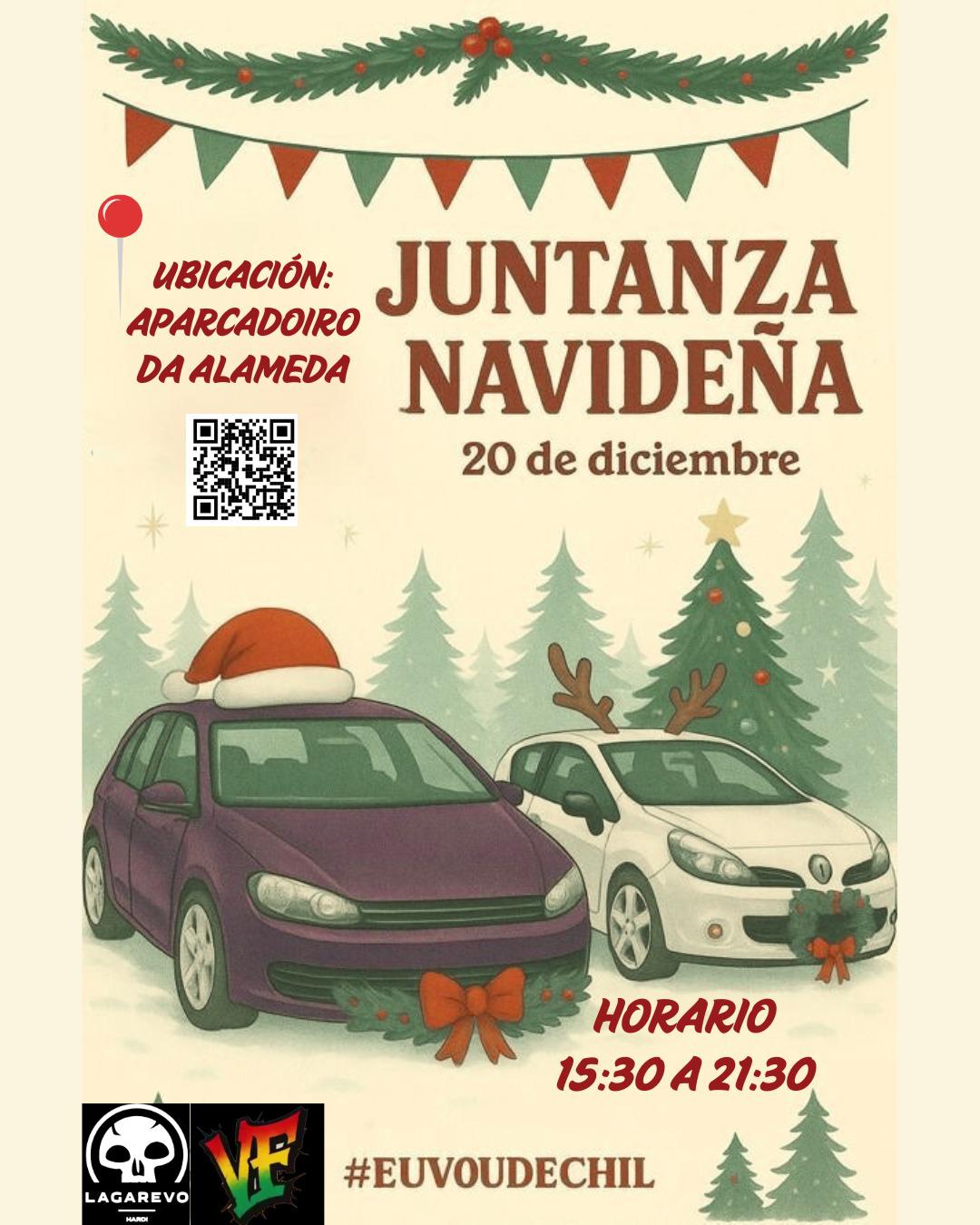 Na tarde do sábado 20 de decembro, o grupo #Euvoudechil organiza unha xuntanza de coches antes de rematar o ano. A xuntanza localizarase no aparcadoiro da Alameda, en Fínola.