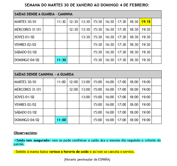 Esta semana as saídas do transbordador veranse afectadas pola marea baixa. Polo tanto, achégase a táboa cos horarios definitivos ata o domingo 4 de febreiro coas saídas confirmadas e aquelas que sofren algunha variación están marcadas.