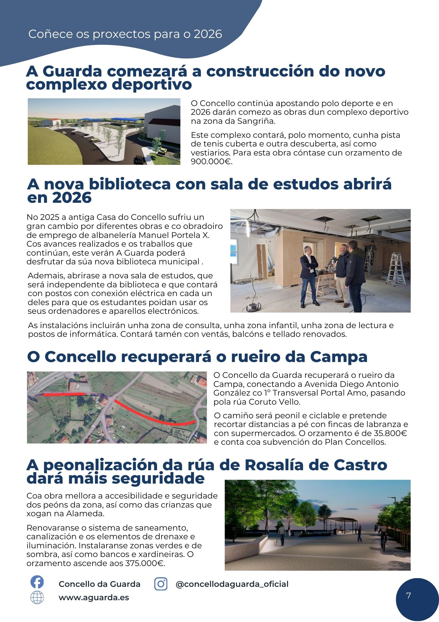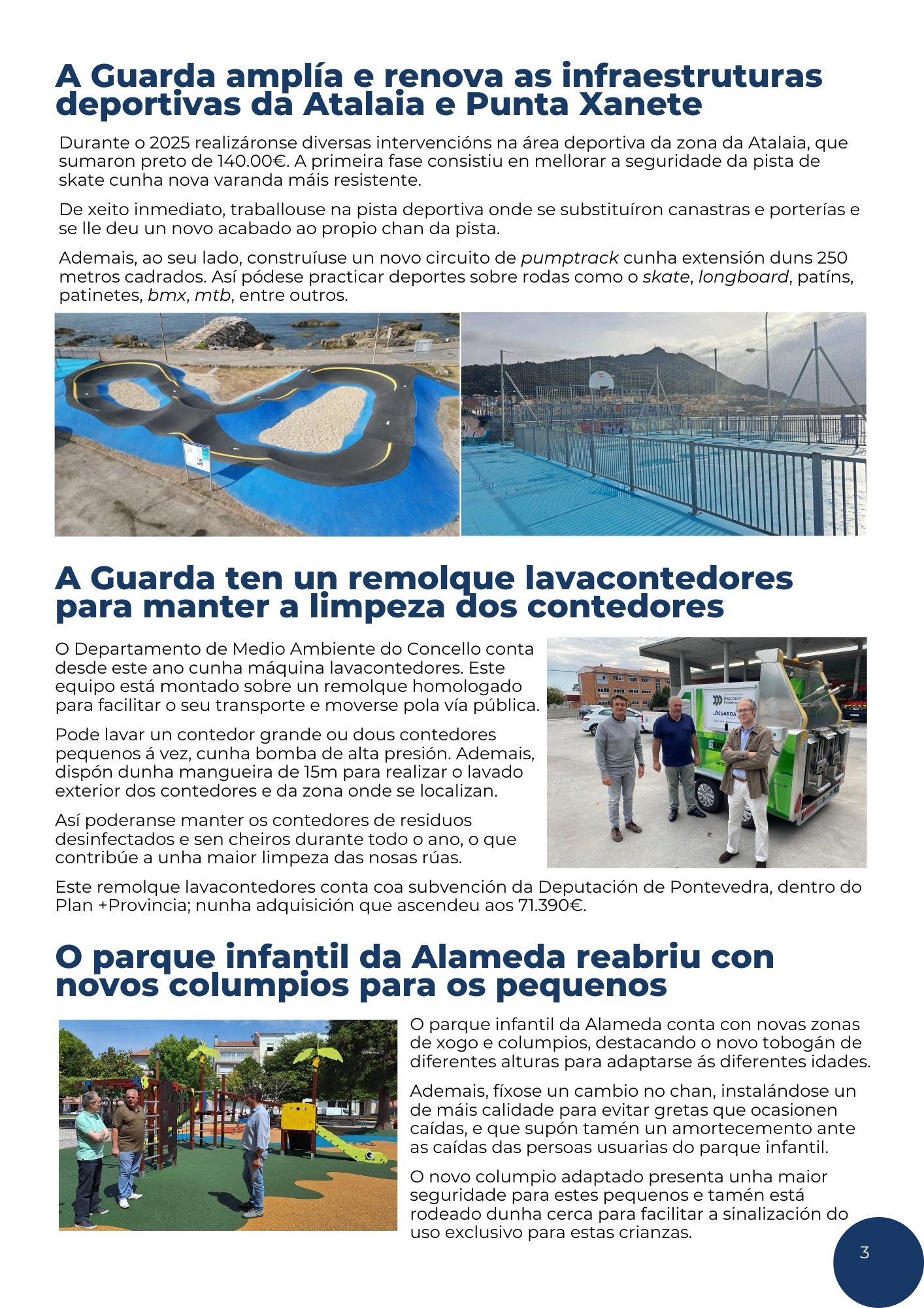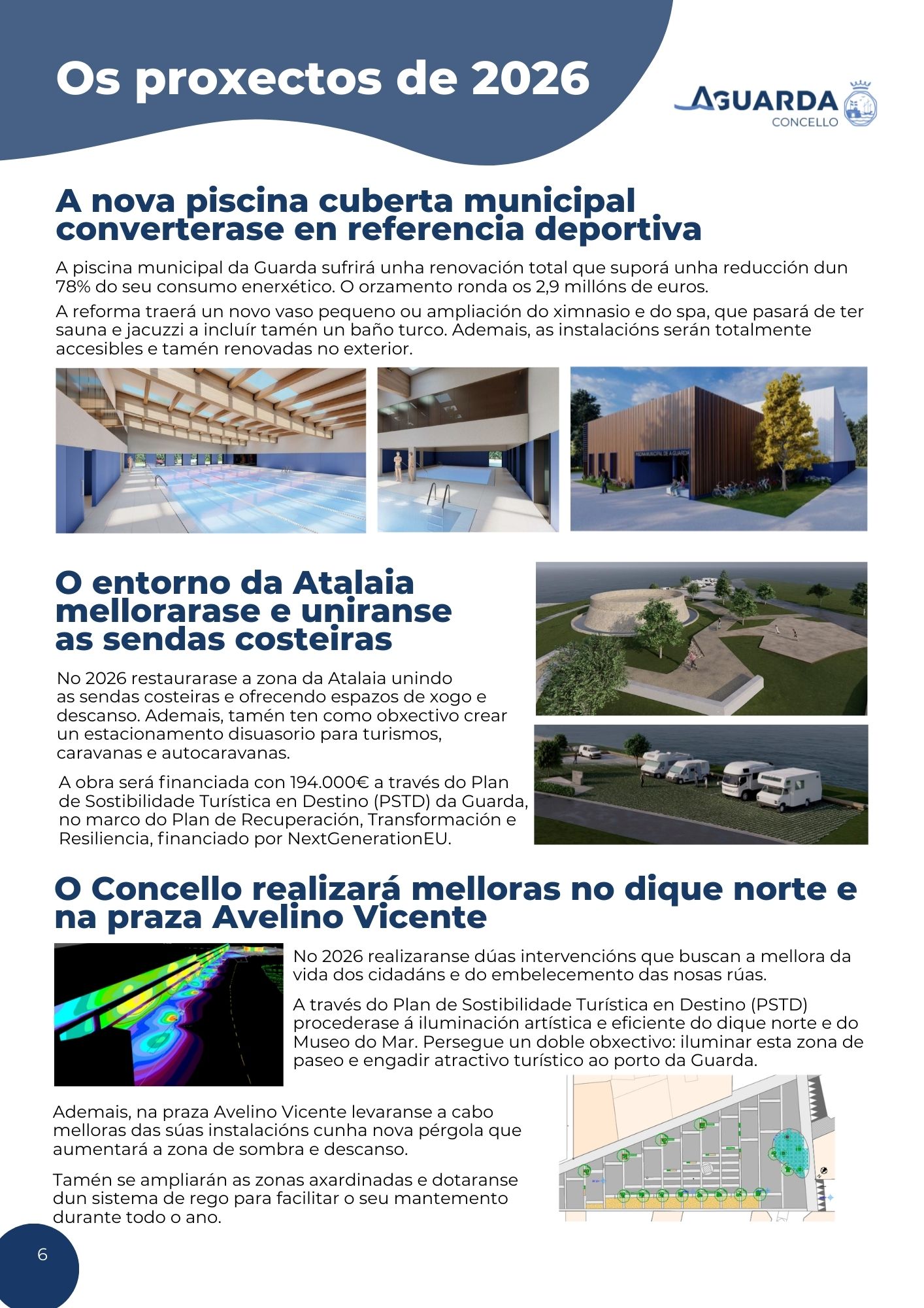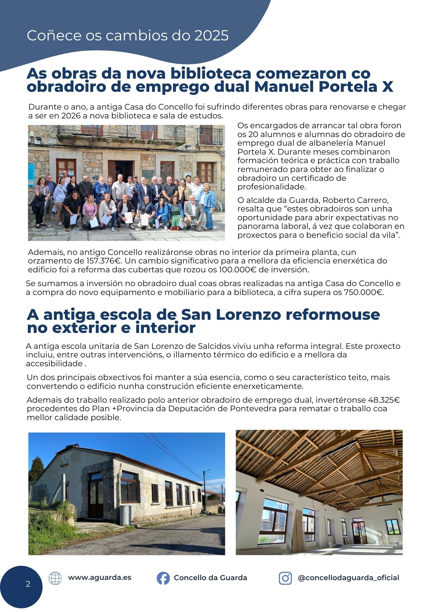 O Concello da Guarda está a difundir un boletín resumindo gran parte dos proxectos realizados na Guarda no 2025, así como os proxectos que xa se iniciaron ou que darán comezo en 2026.