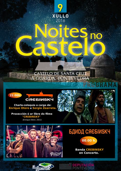 Un dos pratos fortes da fin de semana resérvase para o sábado 9 e terá como escenario o fermoso Castelo de Santa Cruz. Alí celebrarase, por segundo ano, a iniciativa Noites no Castelo que o ano pasado tivo unha gran acollida coa proxección do filme ‘A Esmorga’. Os protagonistas deste ano son a Banda Crebinsky, un grupo de música xurdido dunha maneira orixinal, a partir do mundo imaxinario que retrata o filme “Crebinsky” e da música creada para a banda sonora do mesmo.