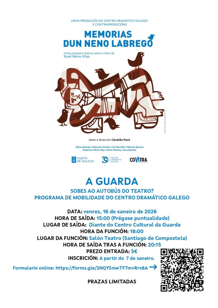 O próximo venres 16 de xaneiro será a primeira saída do bus do teatro desde A Guarda. A obra a ver será “Memorias dun neno labrego”. Trátase dunha nova coprodución do Centro Dramático Galego e Contraproducións. É unha nova versión …